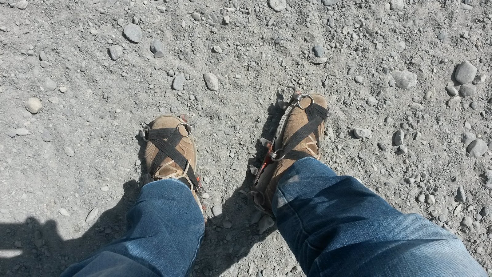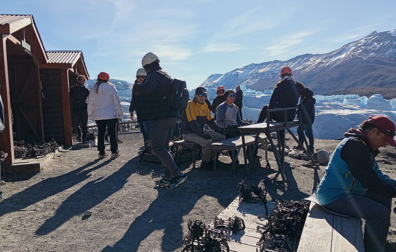 No ponto de acesso ao glaciar, o grupo será dividido em subgrupos de até 20 pessoas. Os guias fornecerão crampons e capacetes e, após uma explicação de segurança, começará o trekking sobre o gelo.