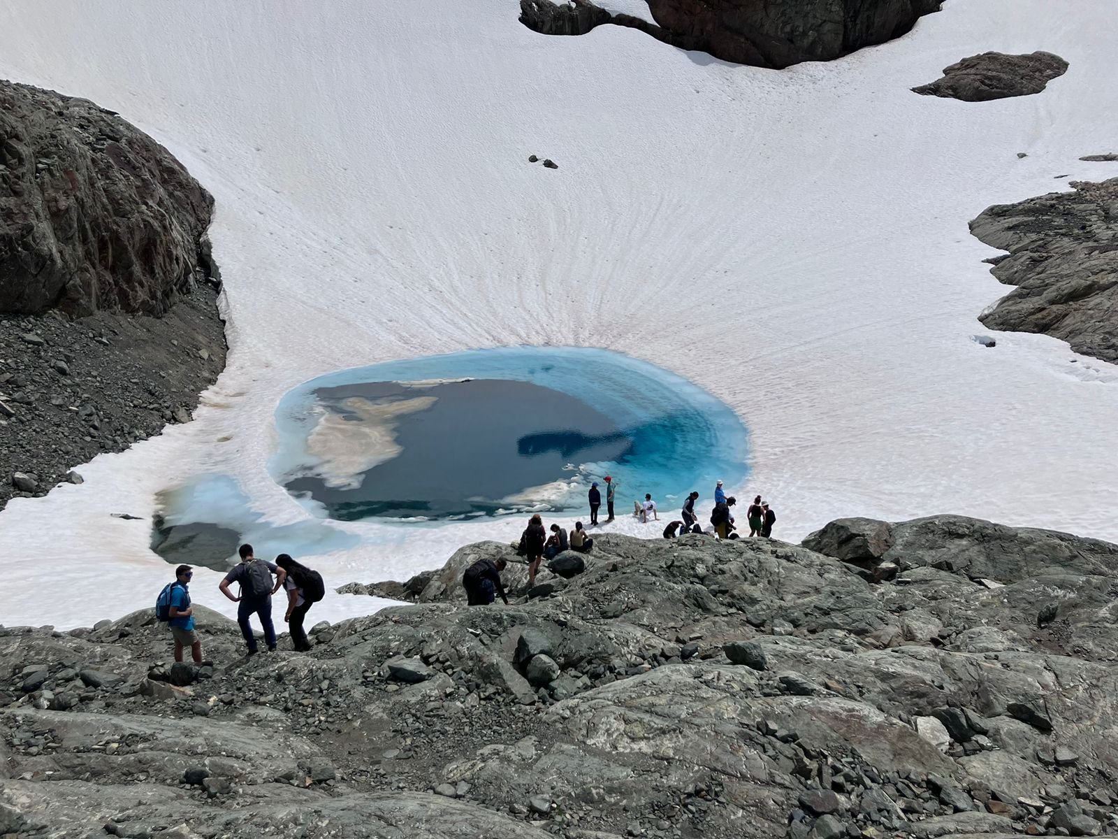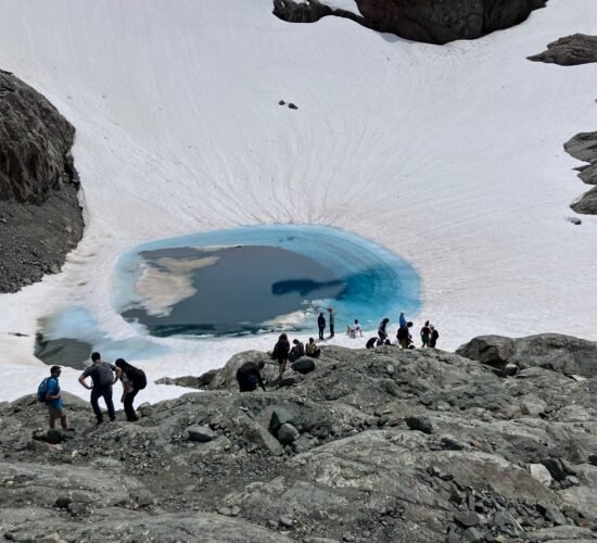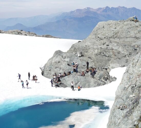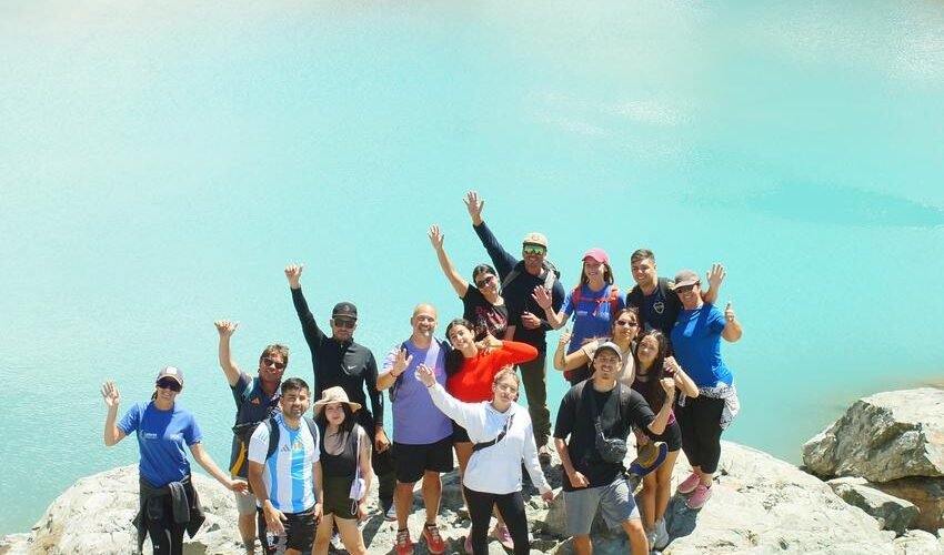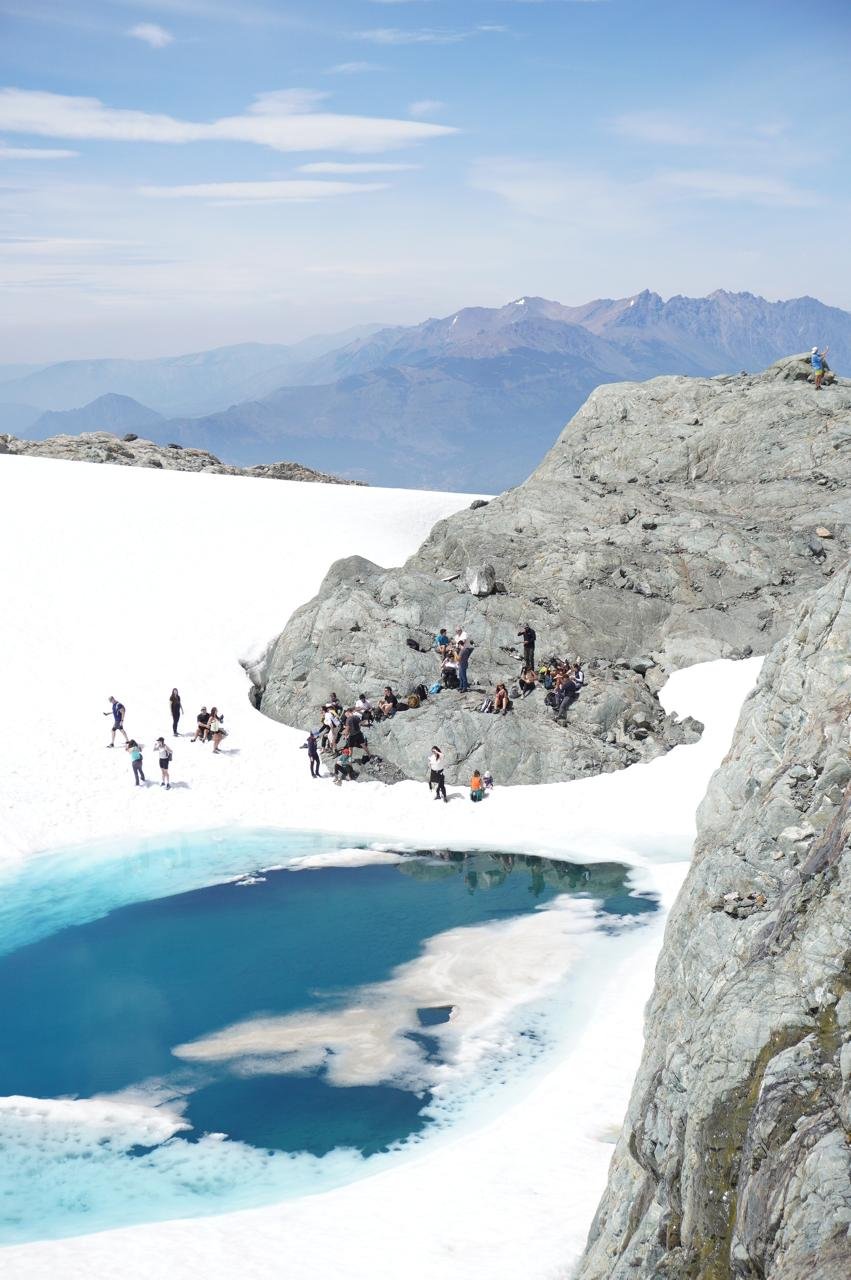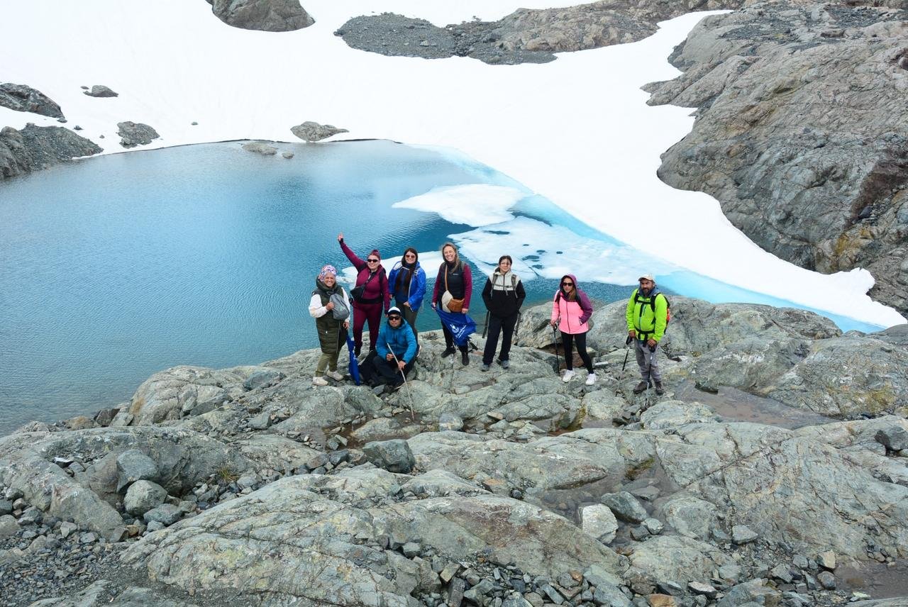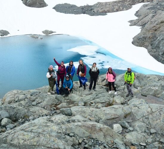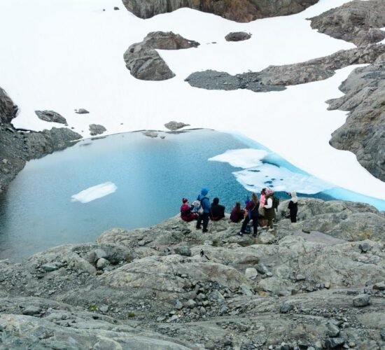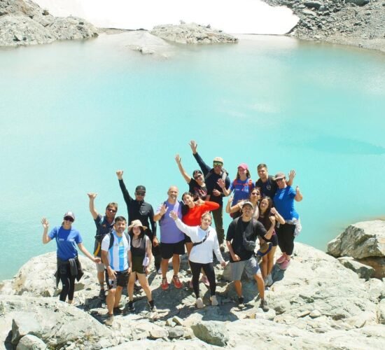 A trilha até a lagoa convida a um passeio tranquilo, acompanhado por guias experientes que conduzem o grupo por ar puro, vistas deslumbrantes e natureza exuberante. E ao final do caminho, lá está ela: uma lagoa congelada e serena, abraçada por imensas montanhas que parecem tê-la protegido desde sempre.