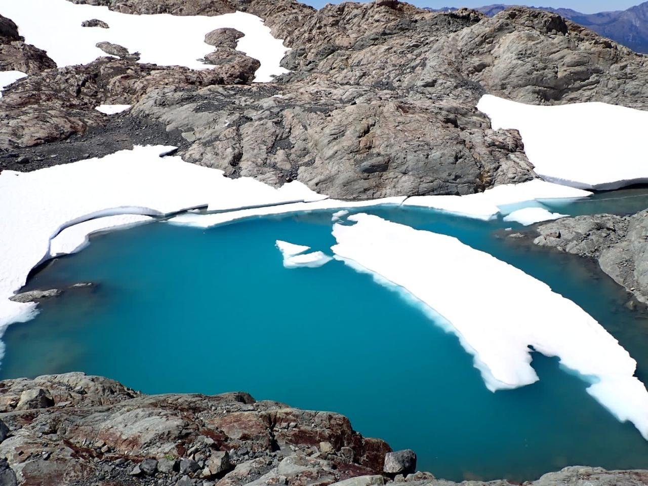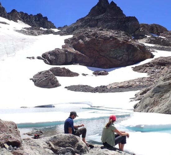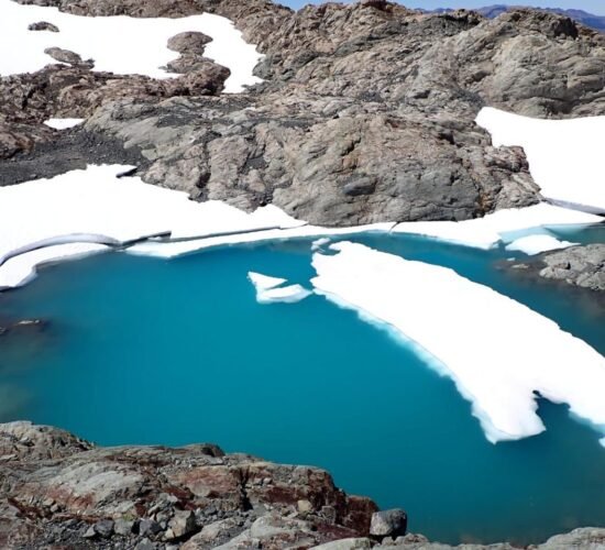 No alto do Cerro Perito Moreno, encontra-se um lugar que desafia as estações: a Laguna del Ventisquero, um espelho d’água que permanece parcialmente congelado mesmo no verão, cercado por manchas de neve que se agarram ao sol da Patagônia. Um lugar mágico, inesperado e profundamente silencioso.