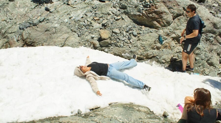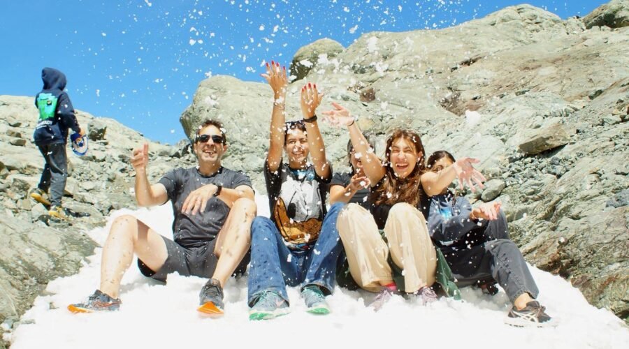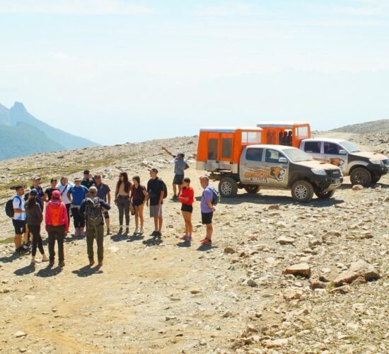 A aventura começa com um passeio de teleférico que te eleva acima de florestas e vales até que a montanha se revele completamente diante dos teus olhos. De lá, veículos 4×4 levam-te ainda mais alto, por estradas onde o verde do verão se mistura com a neve que ainda se agarra às alturas.